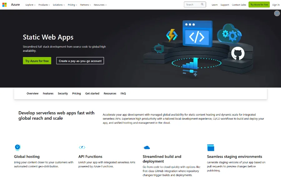 ​Microsoft Azure is a hosting service for web apps on its globally distributed content network by tapping right into the CI/CD workflows to get your site from code to the cloud.
