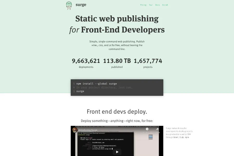 ​Surge offers static web publishing for more experienced front-end developers with a simple, single CLI command to deploy your website for free, without leaving the command line.