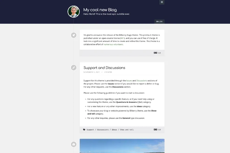 Bilberry is a modern and feature-filled Hugo theme, perfect for any website. Bilberry offers multilingual support in both English and German, built-in content search powered by Algolia SAAS, and it even shows the estimated reading time for each article! Plus, it's fully responsive, so your site will look great on any device. Whether you're creating a blog, portfolio, or corporate website, Bilberry is perfect for the job.
