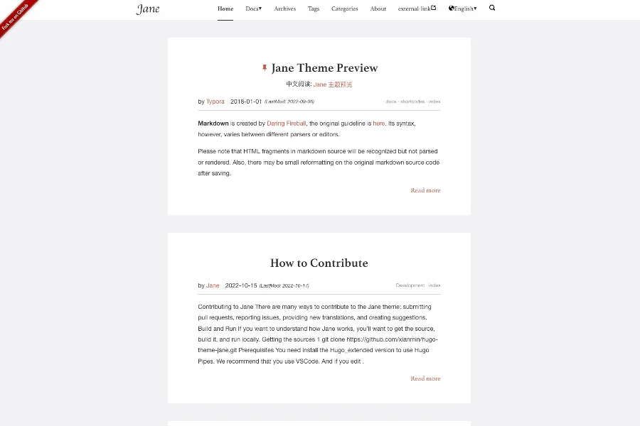 Jane is a beautifully crafted theme for Hugo, designed with the reader in mind. It includes a wide range of additional changes to enhance the reading experience. Jane also supports Multilingual Mode and comes with a range of shortcodes, including image, blockquote, and music, to help you create rich and engaging content. Additionally, the theme is optimized for search, making it easy for your readers to find the information they need. Jane is fully responsive and mobile-friendly, making it easy to read on any device.