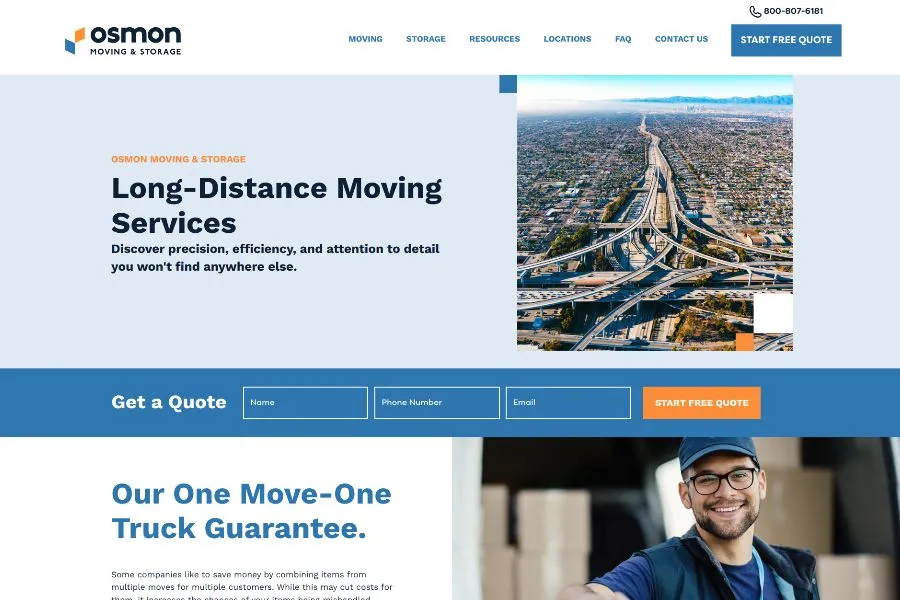 OSMON Moving & Storage, a moving group based out of California, provides a variety of contact options on their page for long-distance moving services.