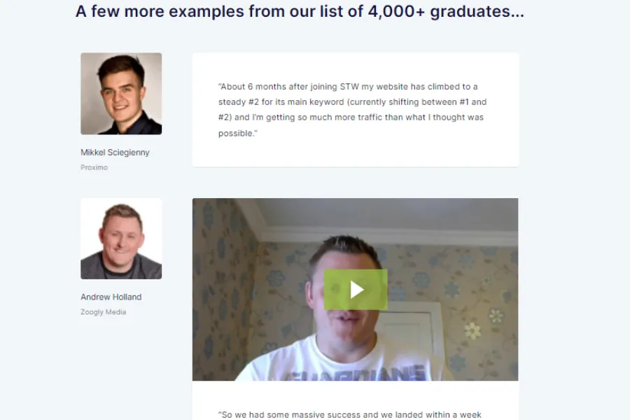 At the bottom of the page, they highlight some of the best testimonials from their 4,000+ graduates! They include quotes, videos, and more.