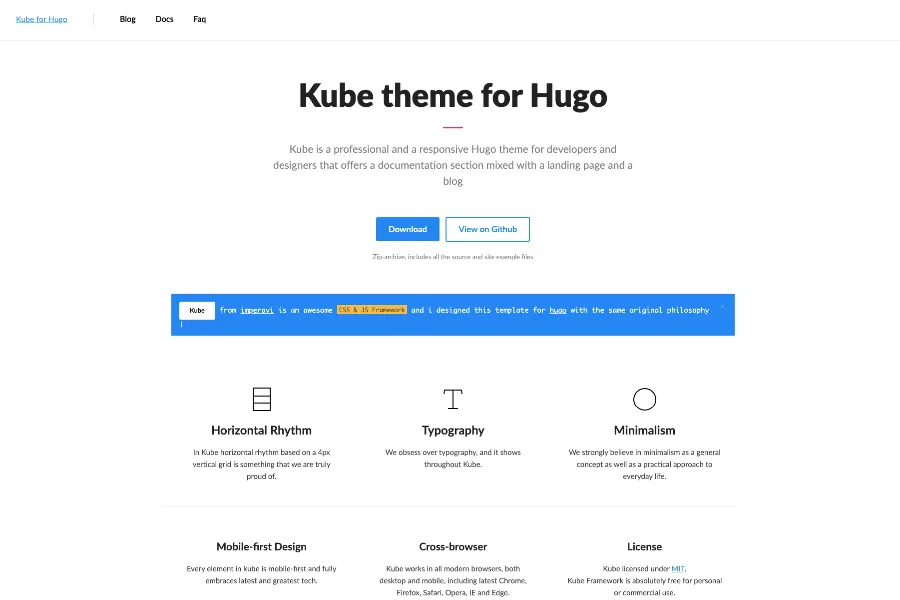 Kube is another responsive Hugo documentation theme created with designers and developers in mind. It's MIT-licensed and completely free for both personal and commercial usage.