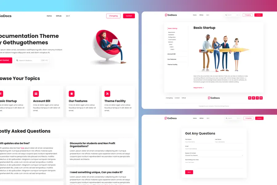 GoDocs offers unique features beyond the classic hugo knowledge base theme. You can use it for software, API, frameworks, plugins, website templates, and more. Also, you’ll get 4 alternative template variants, each with its own style and overall structure.